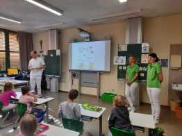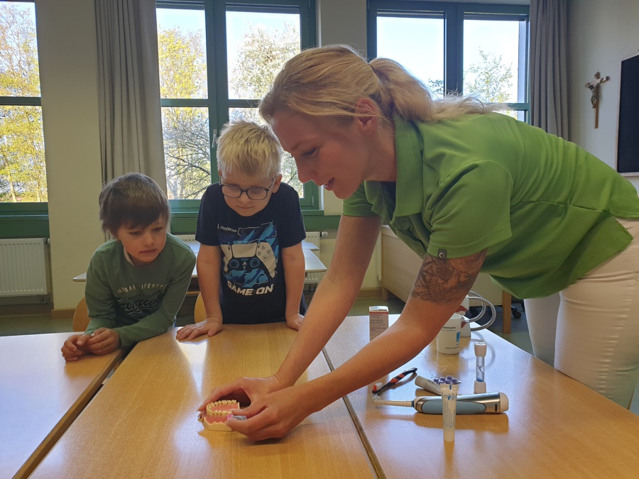 Was macht ein Zahnarzt eigentlich genau? Und warum ist es so wichtig, sich gründlich die Zähne zu putzen? Um diese und weitere Fragen zu klären, startete der Vormittag zunächst mit einer gemeinsamen Gesprächsrunde. Die Kinder durften ihre eigenen Erfahrungen und des bereits im Sachunterricht erlernte Wissen einbringen, während das Fachpersonal anschaulich erklärte, welche Bedeutung unsere Zähne haben und wie Karies überhaupt entsteht.
